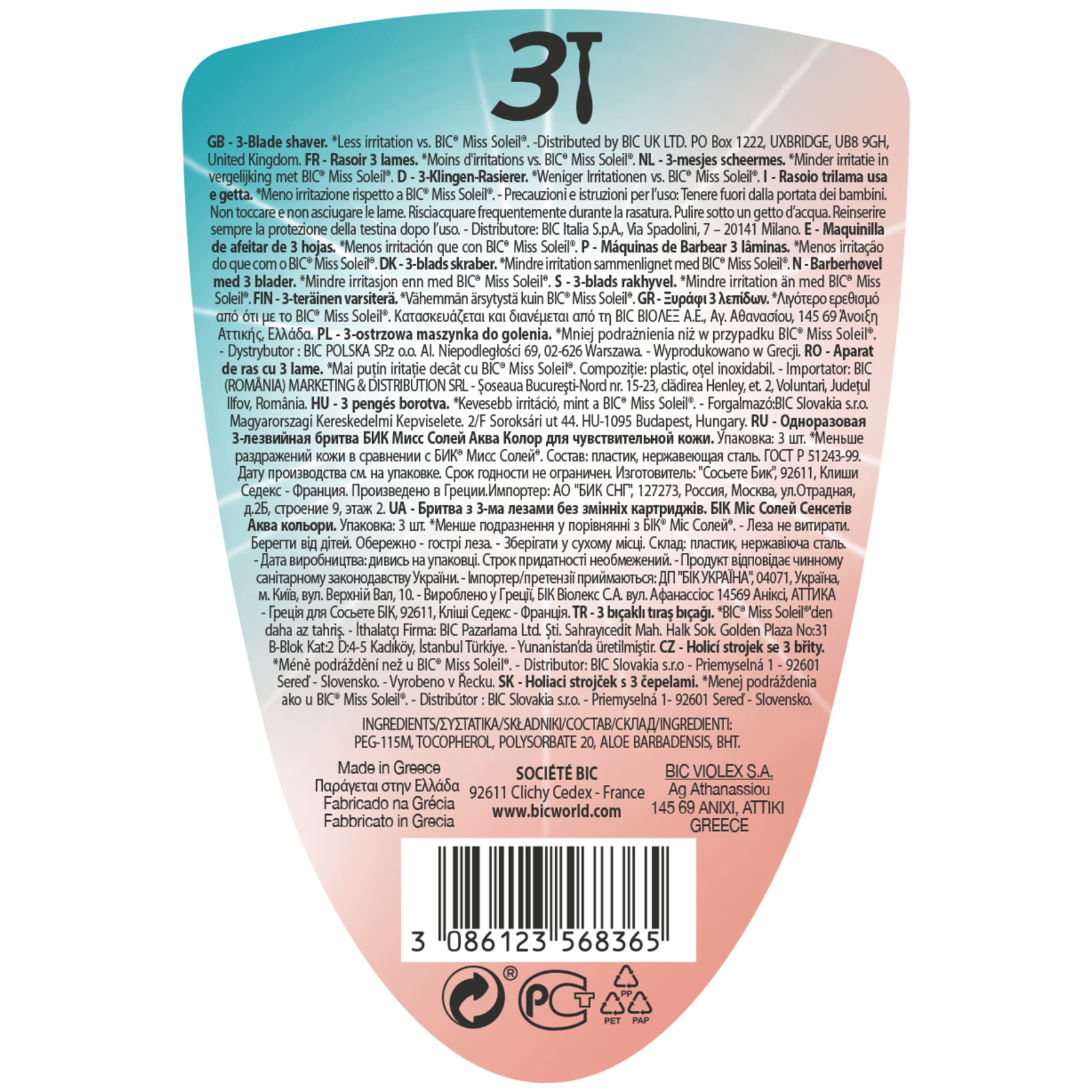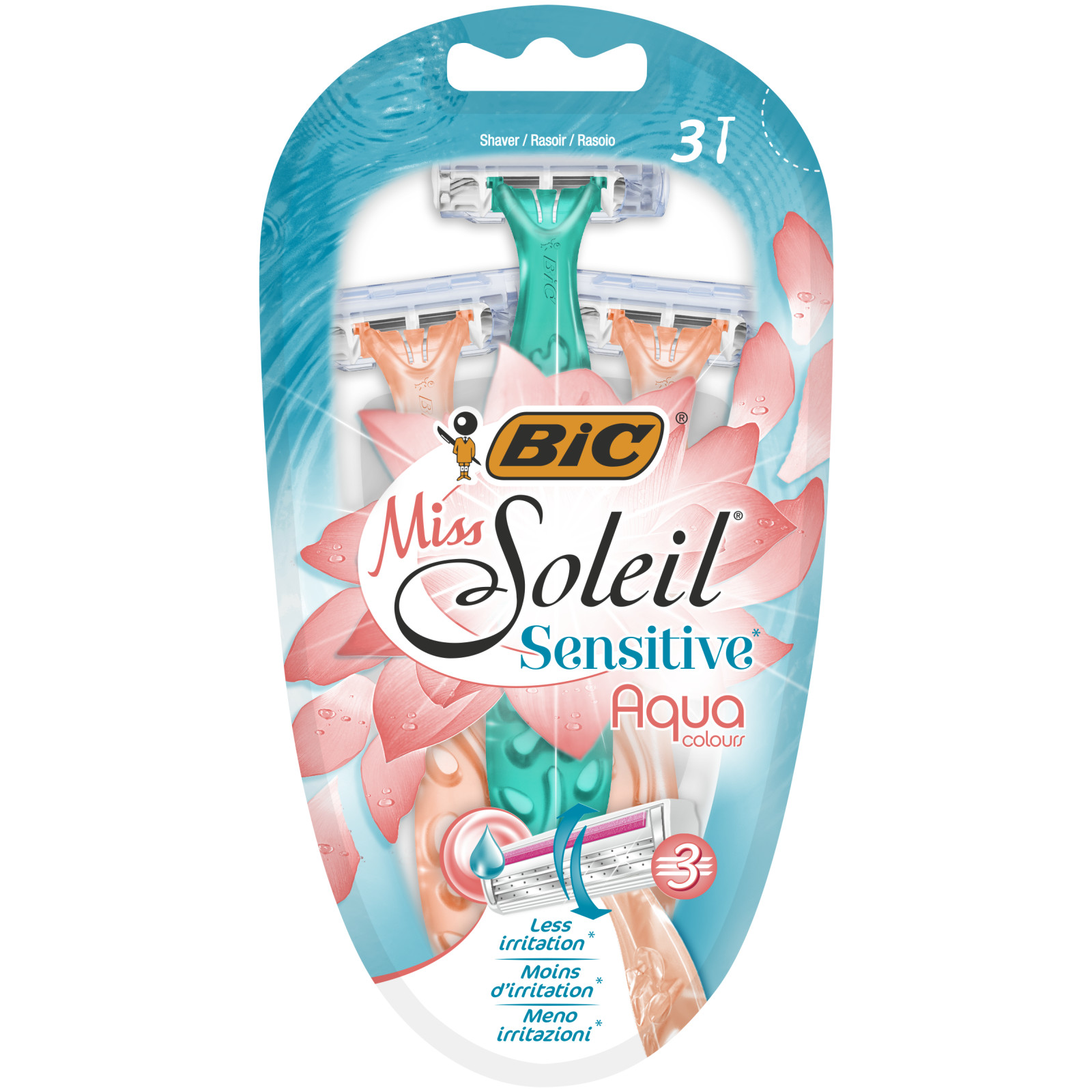 - Αυτό η συσκευασία 3 ξυριστικών BIC Miss Soleil Sensitive Aqua Colors προσφέρει ένα απαλό ξύρισμα με λιγότερους ερεθισμούς συγκριτικά με τα ξυριστικά BIC Miss Soleil